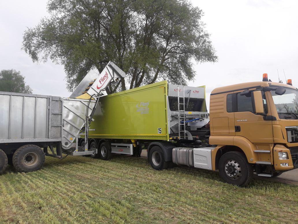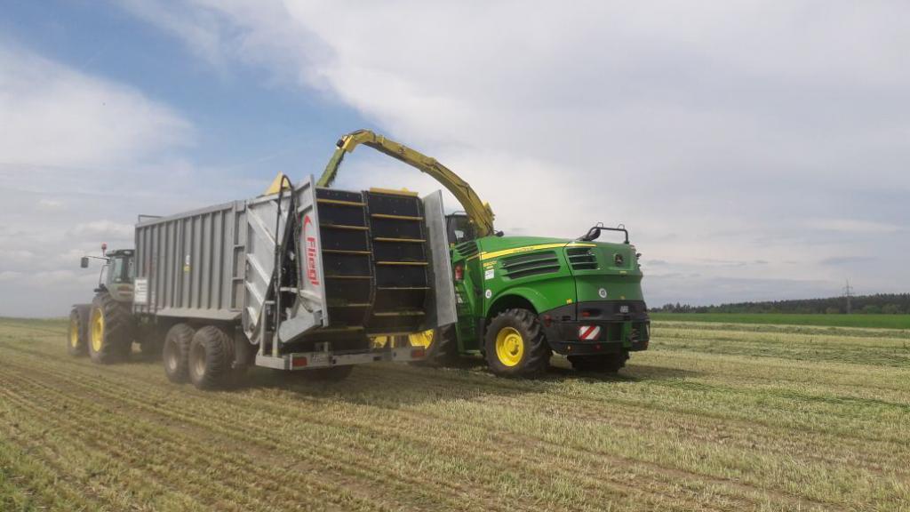 Durch die Montage von Überladebändern an die Fliegl Abschiebewagen ist es möglich Erntegüter wie Gras, GPS und Mais auf den Abschiebewagen zu häckseln und anschließend am Feldrand oder einem anderen geeigneten Platz das Ernte gut auf den Lkw überzuladen.